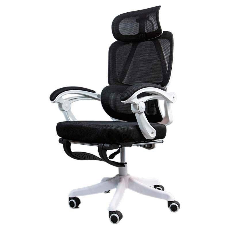 Tela sintética transpirable - Asiento de algodón - Reposabrazos ajustables 2D - 5 ruedas de PU - Pistón de gas 3 niveles - Base de PP tipo estrella - Refuerzo lumbar ajustable - Reposacabezas y reposapiés integrados - Negro+Blanco