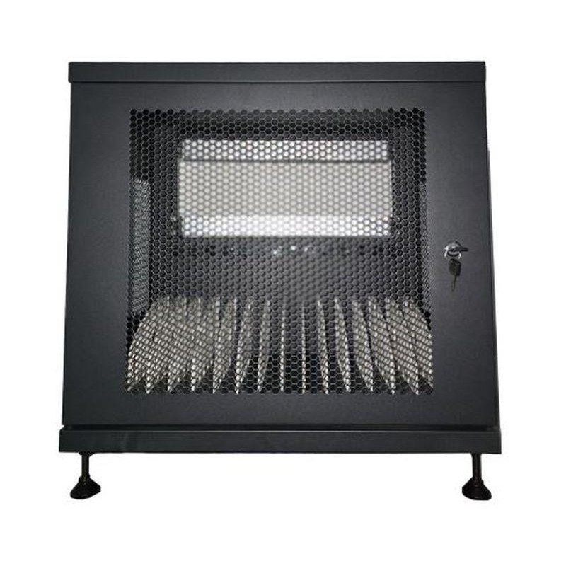 Para garantizar una ventilación óptima, la puerta frontal y el panel trasero están perforados. Además, la seguridad se mejora con una cerradura con llave. Los paneles laterales fijos cuentan con una sección perforada central para facilitar el intercambio de calor y los orificios para el paso de cables están equipados con pasacables de goma. En el interior, un estante con 14 divisores de metal y pasacables permite una gestión ordenada de los cables.