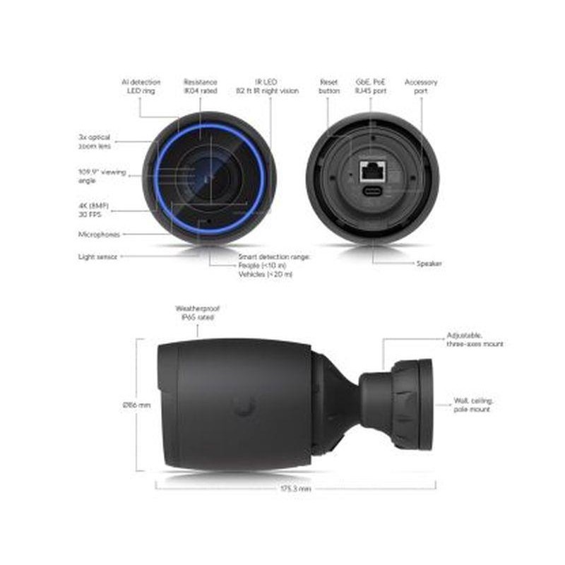 Ubiquiti UVC-AI-Pro Cámara PoE 4K 8MP interior/exterior. Zoom óptico 3x. IA avanzada (detecta personas, matrículas, etc). LED de infrarrojos. Audio bidireccional. Conexión y alimentación PoE. Resisten