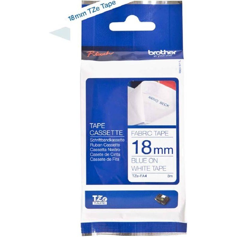 Cinta textil. Texto azul sobre fondo blanco. Ancho: 18 mm. Longitud: 3m