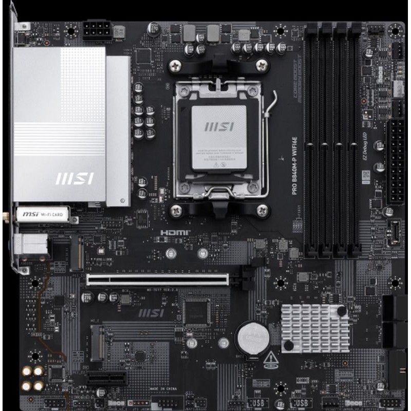 MSI PRO B840M-P WIFI6E. Fabricante de procesador: AMD, Socket de procesador: Zócalo AM5, Procesador compatible: AMD Ryzen 7000 Series, AMD Ryzen 8000 Series, AMD Ryzen 9000 Series. tipos de memoria compatibles: DDR5-SDRAM, Memoria interna máxima: 256 GB, Tipo de ranuras de memoria: DIMM. Interfaces de disco de almacenamiento soportados: M.2, Micro SATA III, Tipos de unidades de almacenamiento admitidas: HDD & SSD, Niveles RAID: 0, 1, 10. Tipo de interfaz ethernet: 2.5 Gigabit Ethernet, Controlador LAN: Realtek RTL8125D, Estándar Wi-Fi: Wi-Fi 6E (802.11ax). Componente para: PC, Factor de forma: micro ATX, Familia del chipset: AMD