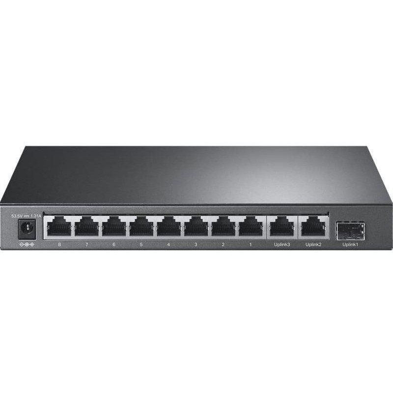 Un switch TP-Link TL-SL1311P que cuenta con 8 puertos RJ45 de 10/100 Mbps, 2 puertos Gigabit RJ45 y 1 puerto SFP Gigabit. Tiene 8 puertos PoE+ que transfieren datos y energía en cables individuales, y funciona con PD compatibles con IEEE 802.3af/at. Además, admite alimentación PoE de hasta 30 W para cada puerto PoE. Un modo de aislamiento permite la separación del tráfico de clientes con un solo clic para aumentar la seguridad y el rendimiento.